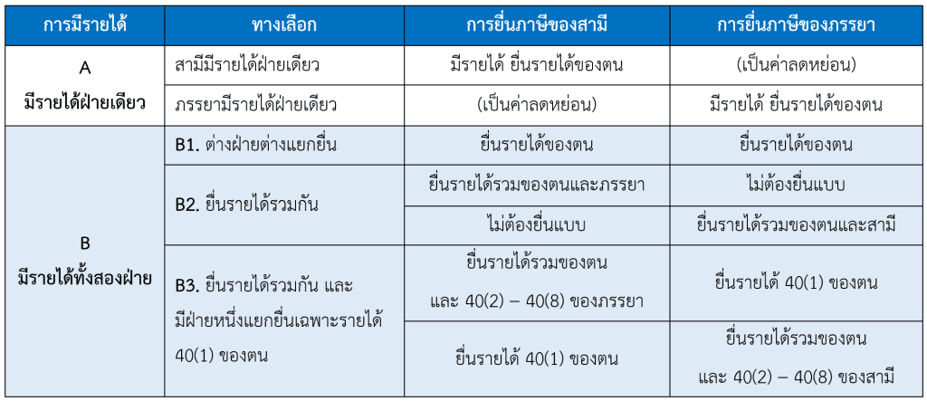 - สิทธิ เลือกวิธียื่นภาษี กรณีมีรายได้ทั้งคู่ โดยสามารถเลือกยื่นภาษี 3 แบบ คือ แยกยื่น, ยื่นรวมทั้งหมด หรือ ยื่นรวมบางส่วน