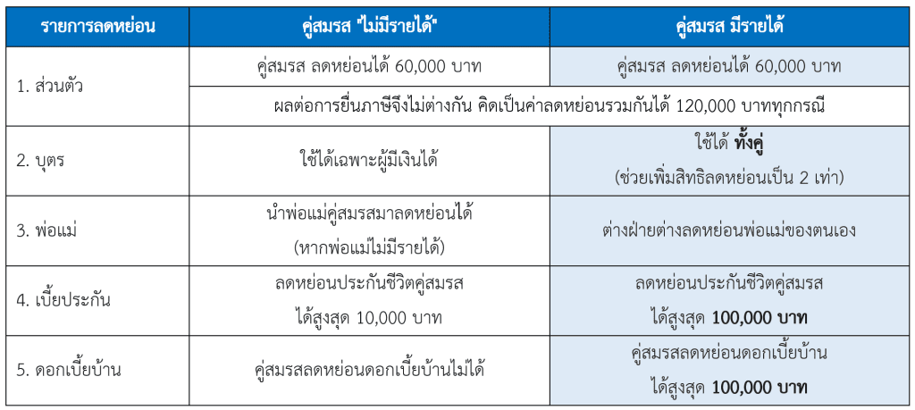 มีค่าลดหย่อนบางส่วนที่ใช้ได้ต่างกัน เมื่อสถานการณ์มีรายได้ของคู่สมรสต่างกัน ดังนี้