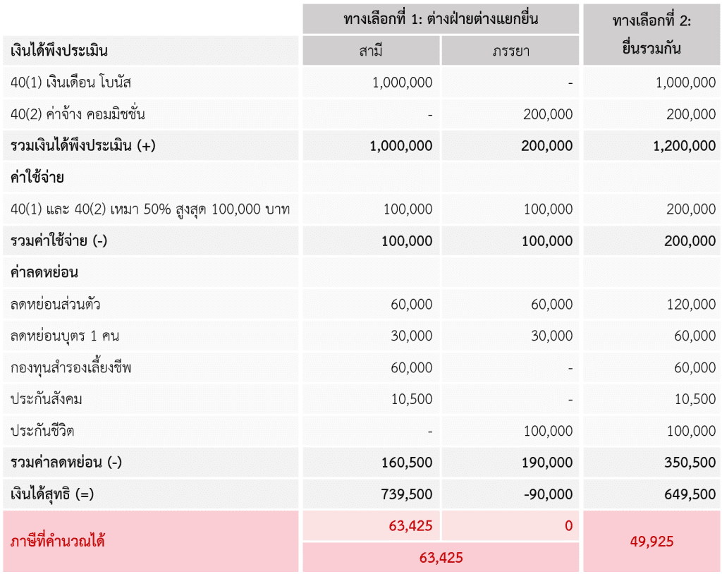 จะเห็นว่ากรณีนี้หากสามีแยกยื่น 40(1) และนำรายได้อื่นยื่นรวมกับภรรยา จะเสียภาษีของครอบครัวน้อยลงถึง 102,950 บาท (จาก 321,875 บาท ลดเหลือ 182,500 บาท)