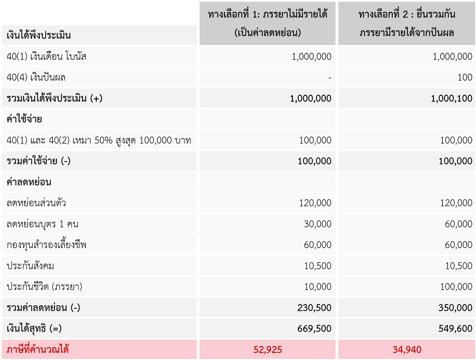 จะเห็นว่ากรณีนี้หากยื่นภาษีรวมกันโดยให้ภรรยามีรายได้จากเงินปันผล จะเสียภาษีน้อยลงถึง 17,985 บาท (จาก 52,925 บาท ลดเหลือ 34,940 บาท)