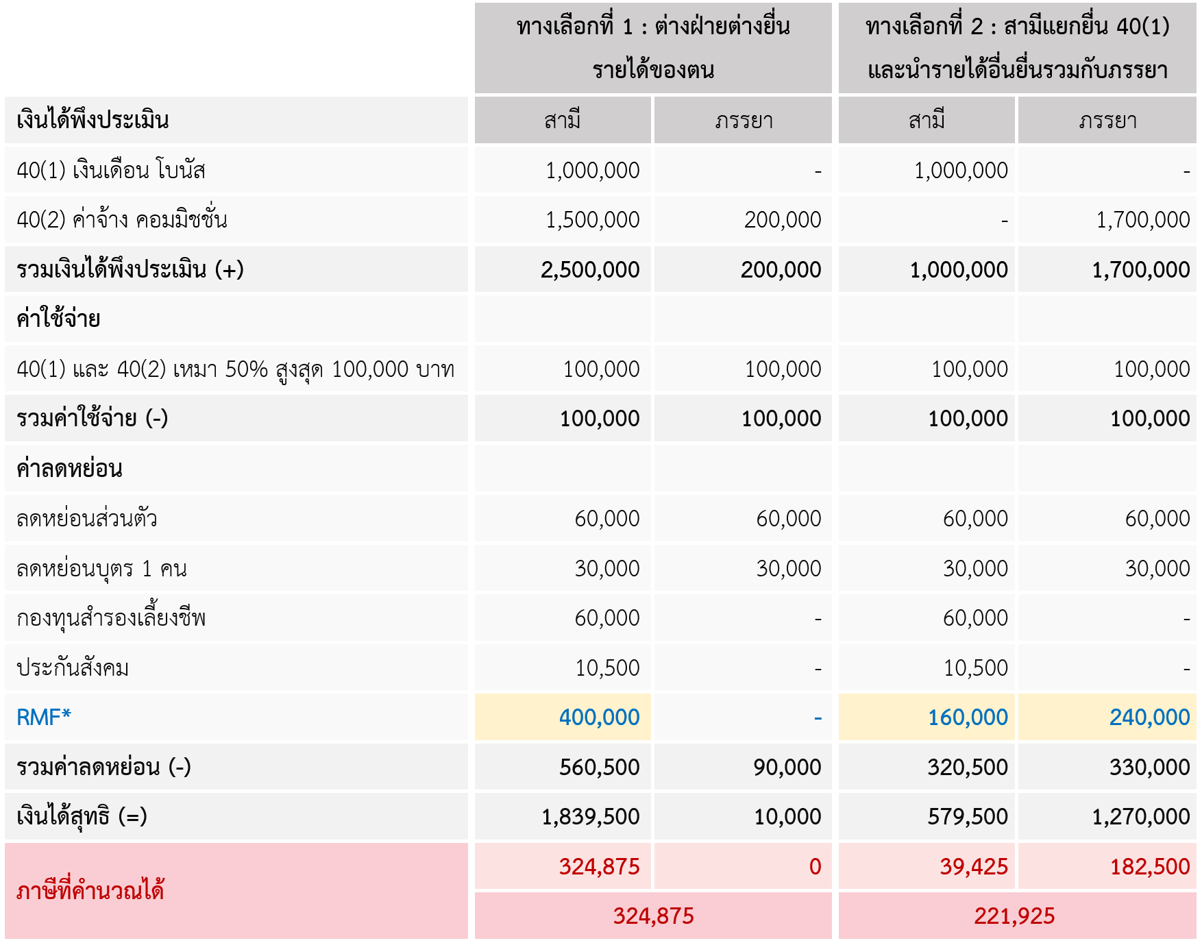 จะเห็นว่ากรณีนี้หากสามีแยกยื่น 40(1) และนำรายได้อื่นยื่นรวมกับภรรยา จะเสียภาษีของครอบครัวน้อยลงถึง 102,950 บาท (จาก 321,875 บาท ลดเหลือ 182,500 บาท)