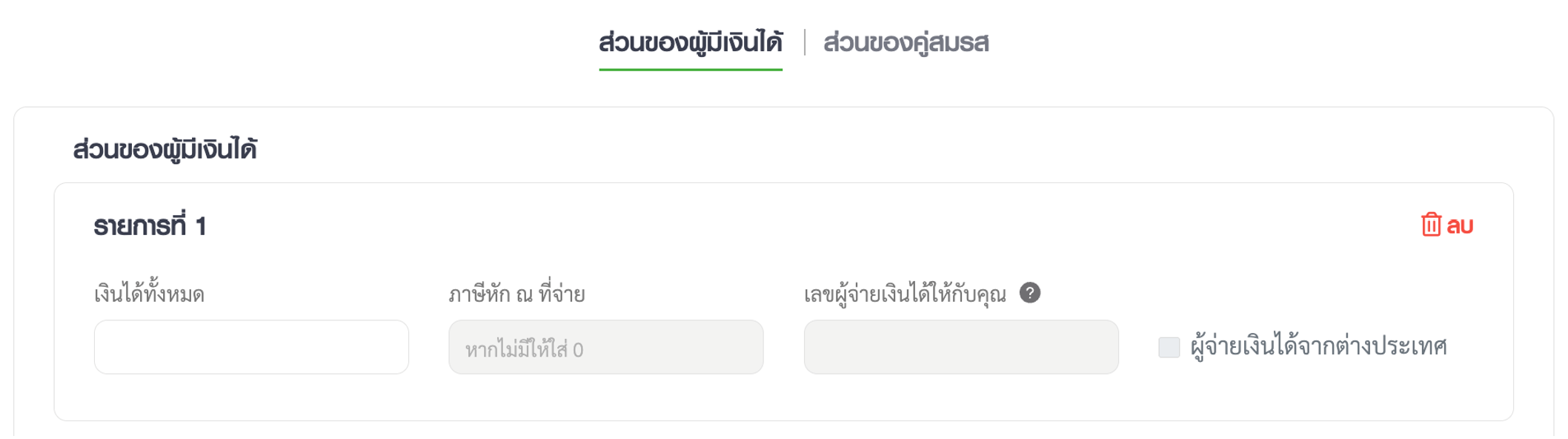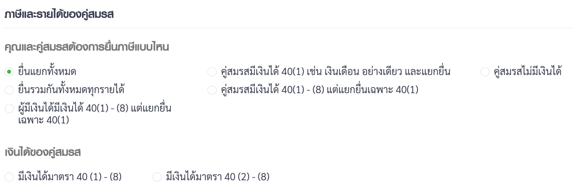 - คู่สมรสมีเงินได้ 40(1) – (8) แต่ยื่นเฉพาะ 40(1) : ยื่นรวมบางส่วนในชื่อเรา แต่คู่สมรสแยกยื่น 40(1) ของคู่สมรส