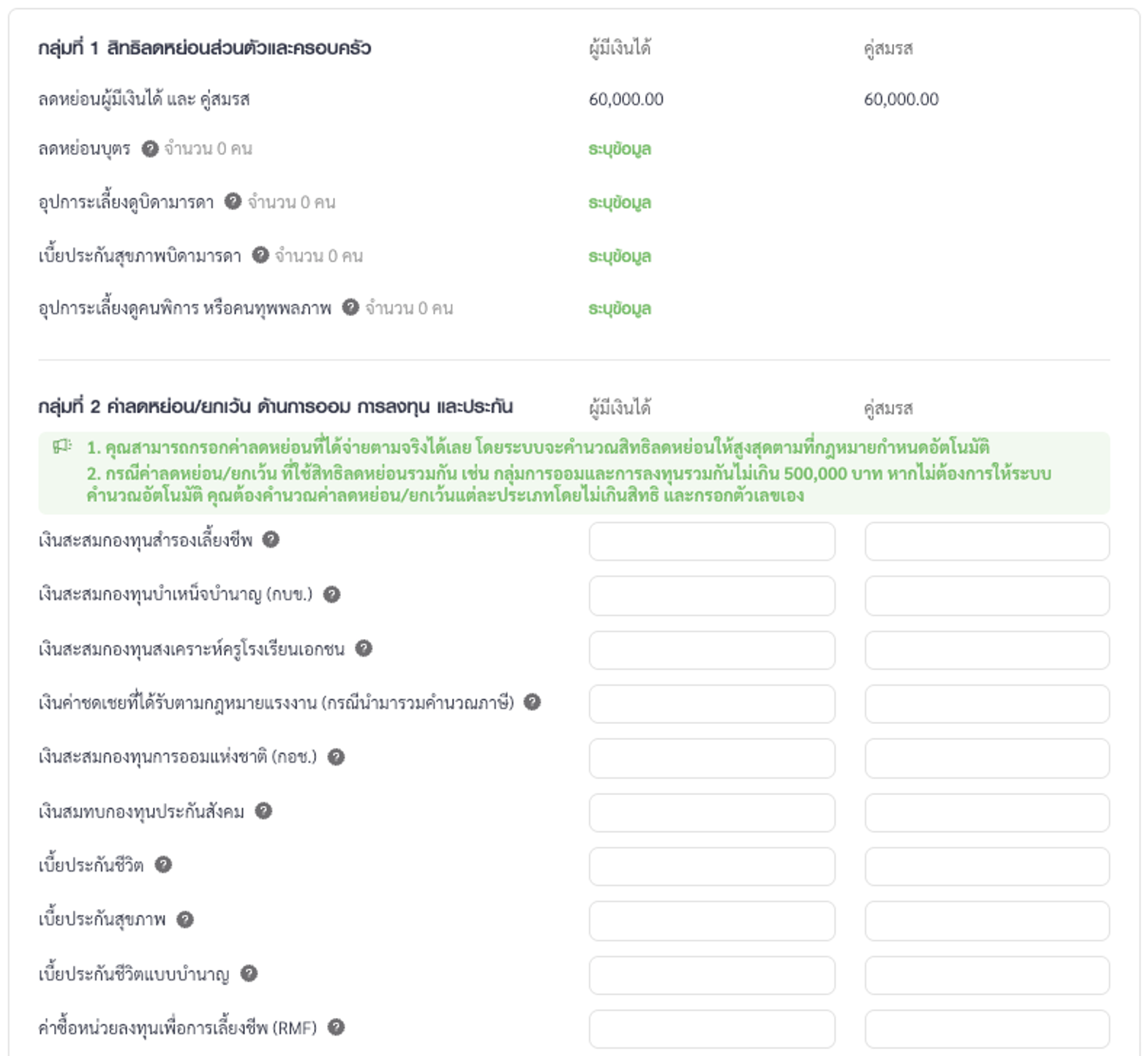 - การกรอกเงินได้และค่าลดหย่อน ต้องระบุให้ถูกต้องว่าเงินได้นั้นเป็นของใคร หรือสิทธิลดหย่อนนั้นใครเป็นผู้ใช้ โดยระบบจะมีให้กรอกทั้งข้อมูลของเรา และข้อมูลของคู่สมรส (หากยื่นรวม)